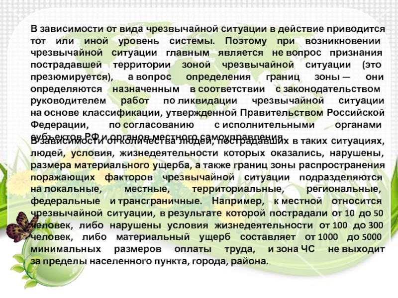 пострадавшей территории зоной чрезвычайной ситуации (это презюмируется), а вопрос определения границ зоны — они определяются назначенным в соответствии с законодательством руководителем работ по ликвидации чрезвычайной ситуации на основе классификации, утвержденной Правительством Российской Федерации, по согласованию с исполнительными органами субъектов РФ и органов местного самоуправления.