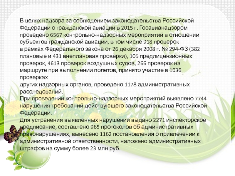 авиации в 2015 г. Госавианадзором проведено 6567 контрольно-надзорных мероприятий в