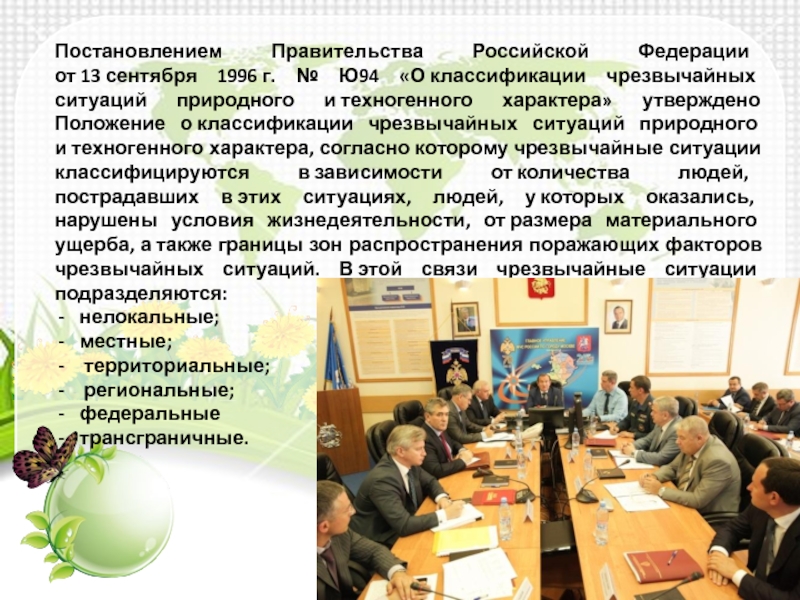 Слайд 7Постановлением Правительства Российской Федерации от 13 сентября 1996 г. № Ю94 «О классификации чрезвычайных