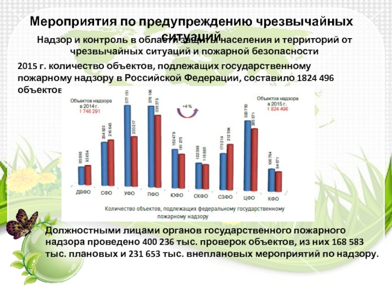 Должностными лицами органов государственного пожарного надзора проведено 400 236 тыс. проверок объектов, из них 168 583 тыс. плановых и 231 653 тыс. внеплановых мероприятий по надзору.