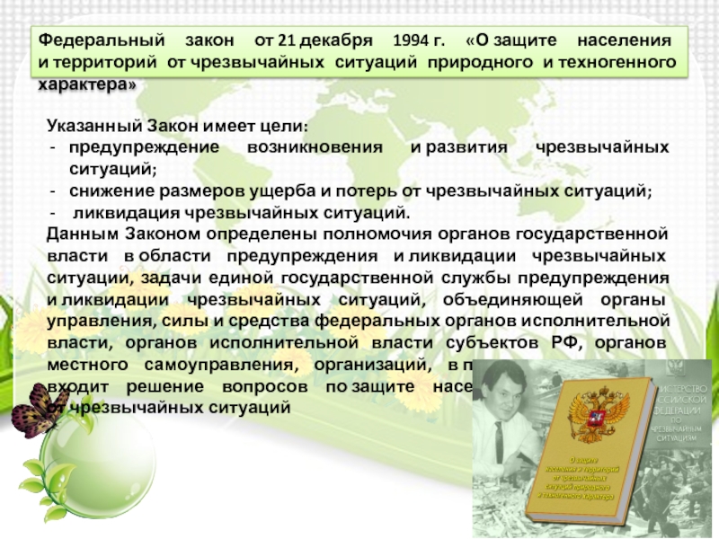 Данным Законом определены полномочия органов государственной власти в области предупреждения и ликвидации чрезвычайных ситуации, задачи единой государственной службы предупреждения и ликвидации чрезвычайных ситуаций, объединяющей органы управления, силы и средства федеральных органов исполнительной власти, органов исполнительной власти субъектов РФ, органов местного самоуправления, организаций, в полномочия которых входит решение вопросов по защите населения и территорий от чрезвычайных ситуаций