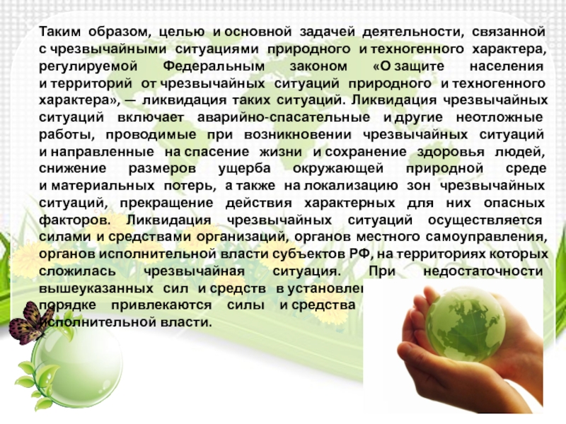 природного и техногенного характера», — ликвидация таких ситуаций. Ликвидация чрезвычайных ситуаций включает аварийно-спасательные и другие неотложные работы, проводимые при возникновении чрезвычайных ситуаций и направленные на спасение жизни и сохранение здоровья людей, снижение размеров ущерба окружающей природной среде и материальных потерь, а также на локализацию зон чрезвычайных ситуаций, прекращение действия характерных для них опасных факторов. Ликвидация чрезвычайных ситуаций осуществляется силами и средствами организаций, органов местного самоуправления, органов исполнительной власти субъектов РФ, на территориях которых сложилась чрезвычайная ситуация. При недостаточности вышеуказанных сил и средств в установленном законодательством порядке привлекаются силы и средства федеральных органов исполнительной власти.