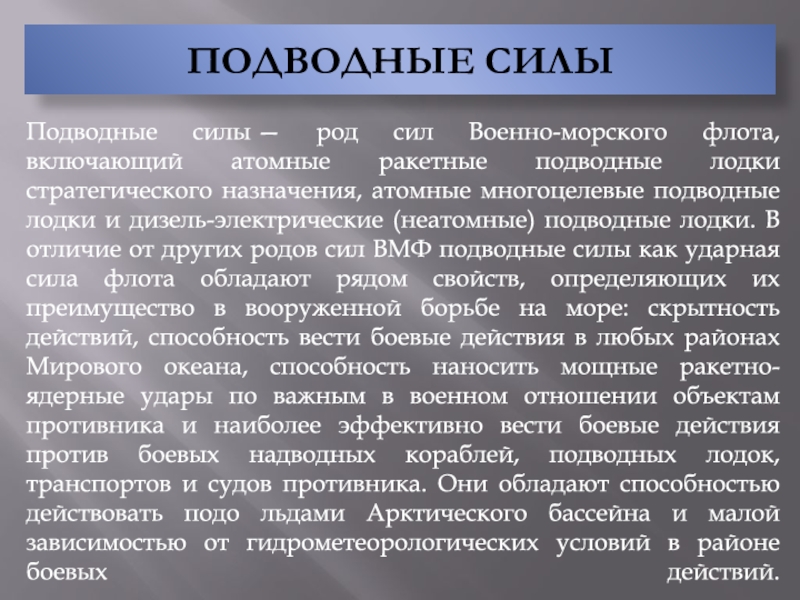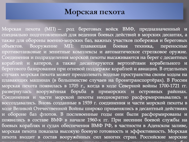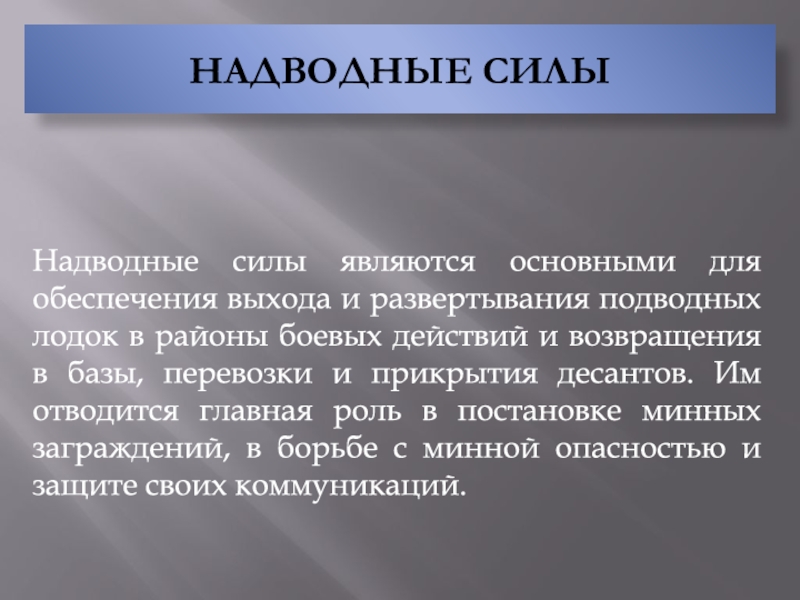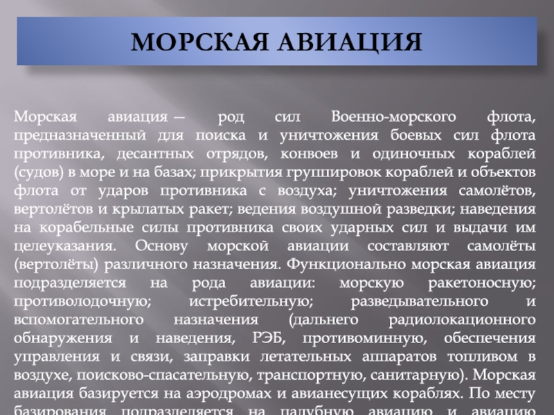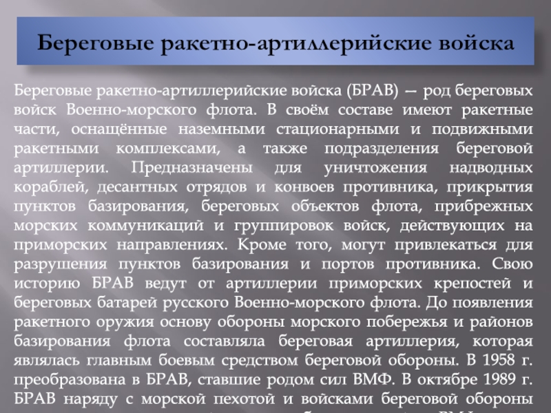 воздействия надводных кораблей противника; обороны военно-морских баз и других важных объектов флотов с суши, в том числе от морских и воздушных десантов; высадки и действий в морских, воздушно-морских десантах; содействия сухопутным войскам в противодесантной обороне десантоопасных районов морского побережья; уничтожения надводных кораблей, катеров и десантно-транспортных средств в зоне досягаемости оружия.