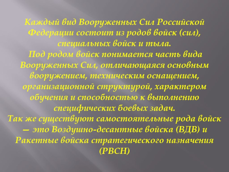 Слайд 3Каждый вид Вооруженных Сил Российской Федерации состоит из родов войск