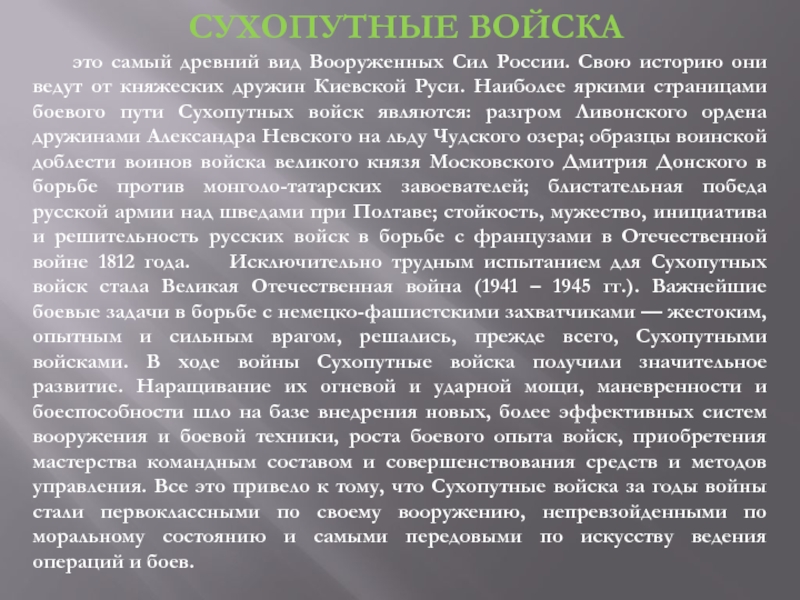 боевого пути Сухопутных войск являются: разгром Ливонского ордена дружинами Александра Невского на льду Чудского озера; образцы воинской доблести воинов войска великого князя Московского Дмитрия Донского в борьбе против монголо-татарских завоевателей; блистательная победа русской армии над шведами при Полтаве; стойкость, мужество, инициатива и решительность русских войск в борьбе с французами в Отечественной войне 1812 года. Исключительно трудным испытанием для Сухопутных войск стала Великая Отечественная война (1941 – 1945 гг.). Важнейшие боевые задачи в борьбе с немецко-фашистскими захватчиками — жестоким, опытным и сильным врагом, решались, прежде всего, Сухопутными войсками. В ходе войны Сухопутные войска получили значительное развитие. Наращивание их огневой и ударной мощи, маневренности и боеспособности шло на базе внедрения новых, более эффективных систем вооружения и боевой техники, роста боевого опыта войск, приобретения мастерства командным составом и совершенствования средств и методов управления. Все это привело к тому, что Сухопутные войска за годы войны стали первоклассными по своему вооружению, непревзойденными по моральному состоянию и самыми передовыми по искусству ведения операций и боев.