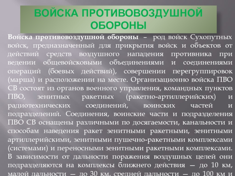 нападения противника при ведении общевойсковыми объединениями и соединениями операций (боевых действий), совершении перегруппировок (марша) и расположении на месте. Организационно войска ПВО СВ состоят из органов военного управления, командных пунктов ПВО, зенитных ракетных (ракетно-артиллерийских) и радиотехнических соединений, воинских частей и подразделений. Соединения, воинские части и подразделения ПВО СВ оснащены различными по досягаемости, канальности и способам наведения ракет зенитными ракетными, зенитными артиллерийскими, зенитными пушечно-ракетными комплексами (системами) и переносными зенитными ракетными комплексами. В зависимости от дальности поражения воздушных целей они подразделяются на комплексы ближнего действия — до 10 км, малой дальности — до 30 км, средней дальности — до 100 км и дальнего действия — более 100 км.