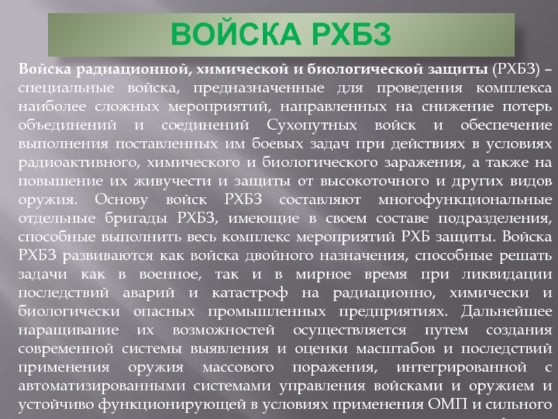 объединений и соединений Сухопутных войск и обеспечение выполнения поставленных им боевых задач при действиях в условиях радиоактивного, химического и биологического заражения, а также на повышение их живучести и защиты от высокоточного и других видов оружия. Основу войск РХБЗ составляют многофункциональные отдельные бригады РХБЗ, имеющие в своем составе подразделения, способные выполнить весь комплекс мероприятий РХБ защиты. Войска РХБЗ развиваются как войска двойного назначения, способные решать задачи как в военное, так и в мирное время при ликвидации последствий аварий и катастроф на радиационно, химически и биологически опасных промышленных предприятиях. Дальнейшее наращивание их возможностей осуществляется путем создания современной системы выявления и оценки масштабов и последствий применения оружия массового поражения, интегрированной с автоматизированными системами управления войсками и оружием и устойчиво функционирующей в условиях применения ОМП и сильного радиоэлектронного противодействия.