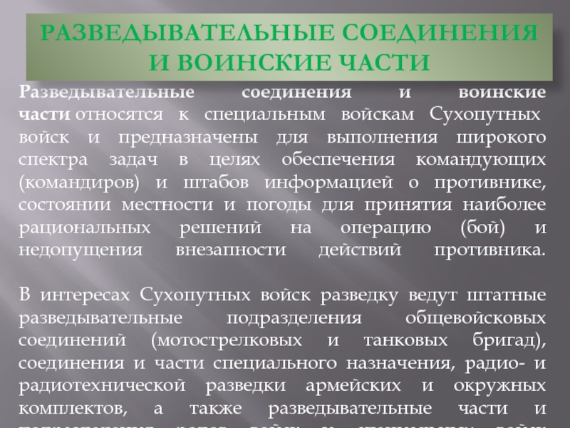 Слайд 21РАЗВЕДЫВАТЕЛЬНЫЕ СОЕДИНЕНИЯ И ВОИНСКИЕ ЧАСТИ