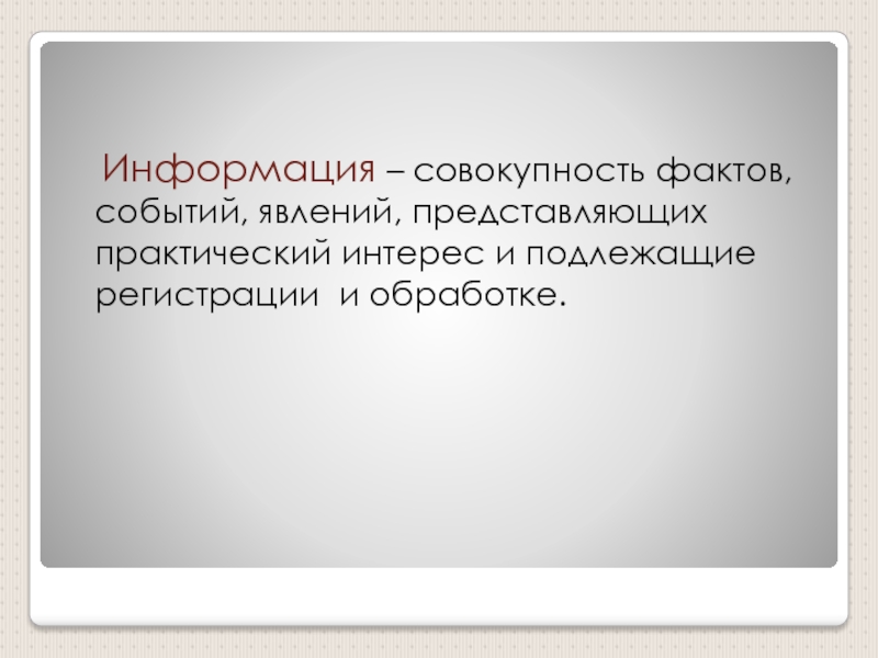 Информация – совокупность фактов, событий, явлений, представляющих практический интерес и подлежащие регистрации и обработке.