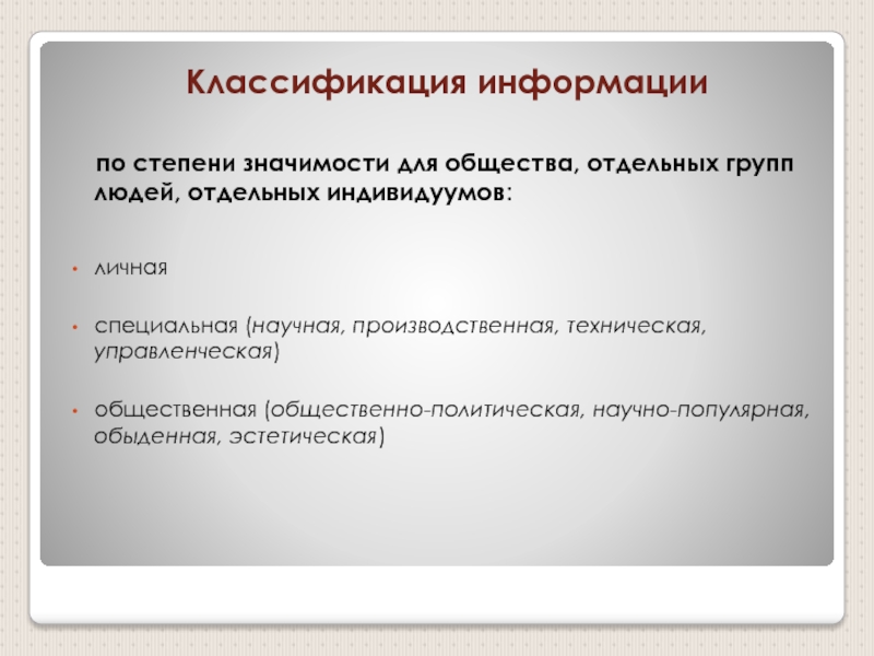 Классификация информации  по степени значимости для общества, отдельных групп людей, отдельных индивидуумов:личнаяспециальная (научная, производственная, техническая, управленческая)общественная
