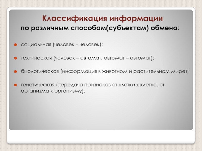 Классификация информации  по различным способам(субъектам) обмена:социальная (человек – человек);техническая (человек – автомат, автомат – автомат);биологическая (информация