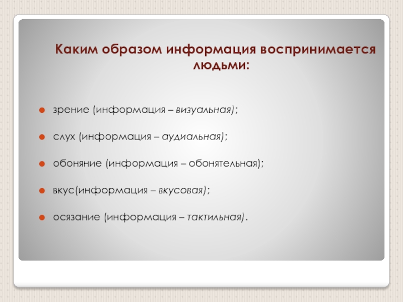 Каким образом информация воспринимается людьми:зрение (информация – визуальная);слух (информация – аудиальная);обоняние (информация – обонятельная);вкус(информация – вкусовая);осязание (информация