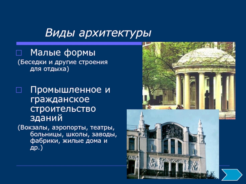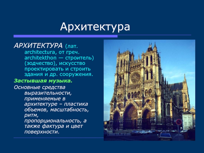 Основные средства выразительности, применяемые в архитектуре – пластика объемов, масштабность, ритм, пропорциональность, а также фактура и цвет поверхности.