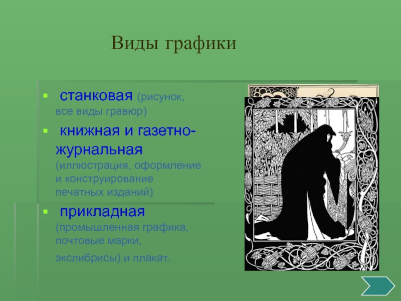 прикладная (промышленная графика, почтовые марки, экслибрисы) и плакат.