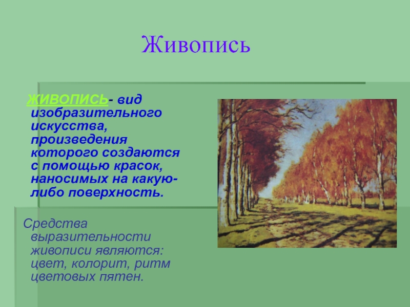 Средства выразительности живописи являются: цвет, колорит, ритм цветовых пятен.