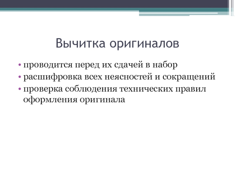 Вычитка оригиналов проводится перед их сдачей в наборрасшифровка всех неясностей и сокращенийпроверка соблюдения технических правил оформления оригинала
