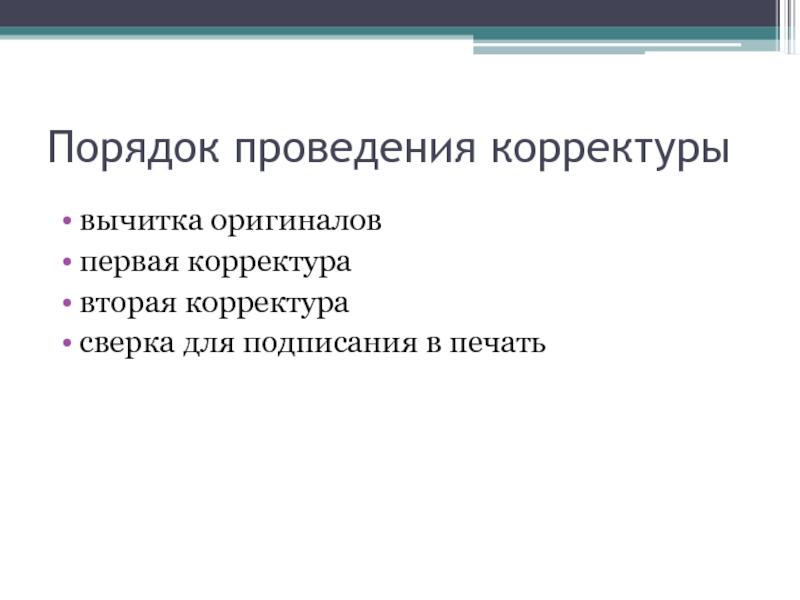 Порядок проведения корректуры вычитка оригиналовпервая корректуравторая корректурасверка для подписания в печать
