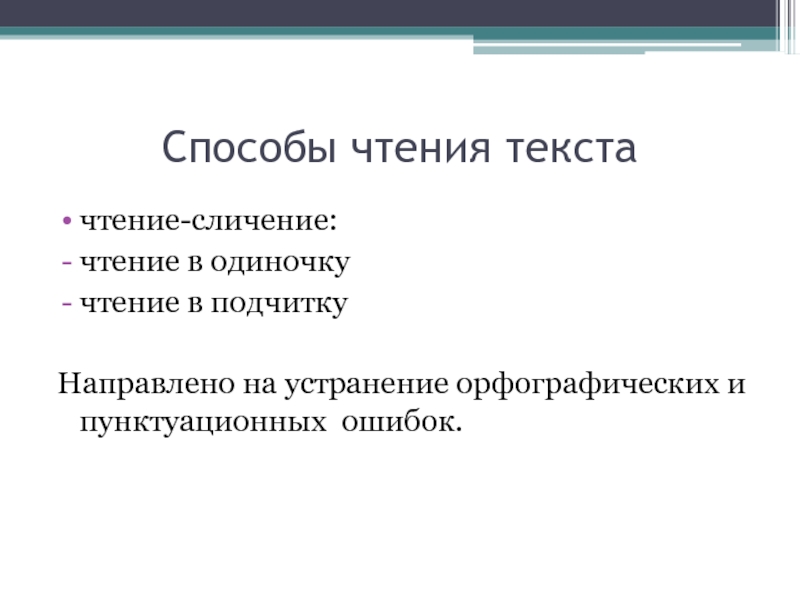 Способы чтения текстачтение-сличение:чтение в одиночкучтение в подчиткуНаправлено на устранение орфографических и пунктуационных ошибок.