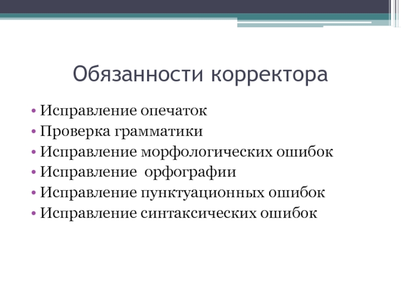 Обязанности корректораИсправление опечатокПроверка грамматикиИсправление морфологических ошибокИсправление орфографииИсправление пунктуационных ошибокИсправление синтаксических ошибок