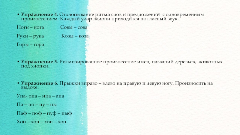 Упражнение 4. Отхлопывание ритма слов и предложений  с одновременным произнесением. Каждый удар ладони приходится на гласный звук.Ноги –