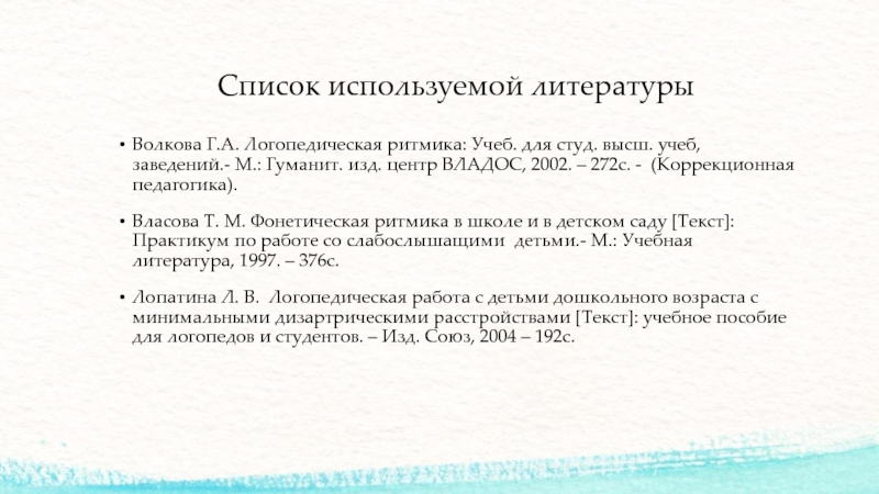 Список используемой литературыВолкова Г.А. Логопедическая ритмика: Учеб. для студ. высш. учеб, заведений.- М.: Гуманит. изд. центр ВЛАДОС,