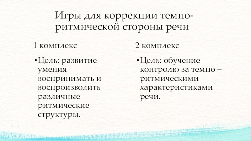 Игры для коррекции темпо-ритмической стороны речи 1 комплексЦель: развитие умения воспринимать и воспроизводить различные ритмические структуры.2 комплексЦель: