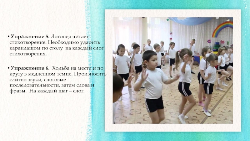 Упражнение 5. Логопед читает стихотворение. Необходимо ударить карандашом по столу  на каждый слог стихотворения. Упражнение 6.  Ходьба