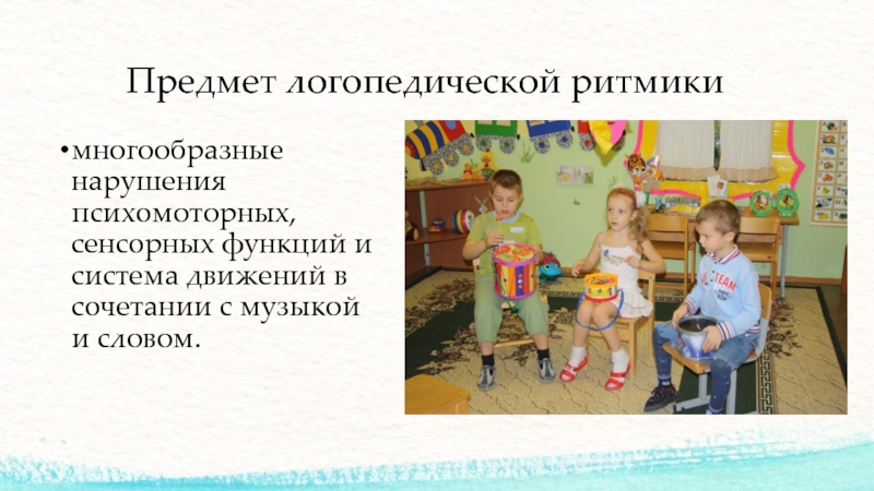 Предмет логопедической ритмикимногообразные нарушения психомоторных, сенсорных функций и система движений в сочетании с музыкой и словом.
