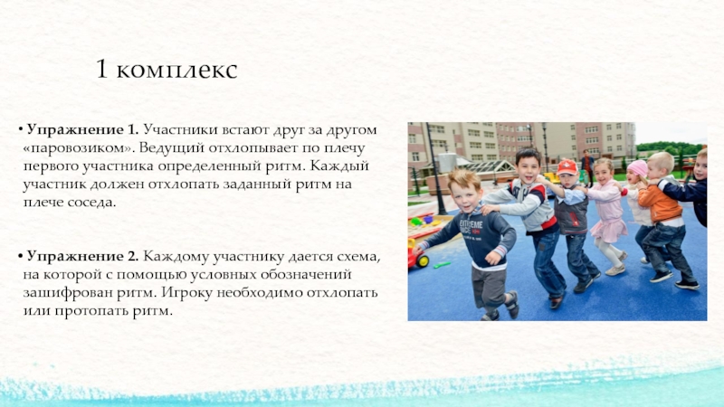 1 комплекс Упражнение 1. Участники встают друг за другом «паровозиком». Ведущий отхлопывает по плечу первого участника определенный ритм.