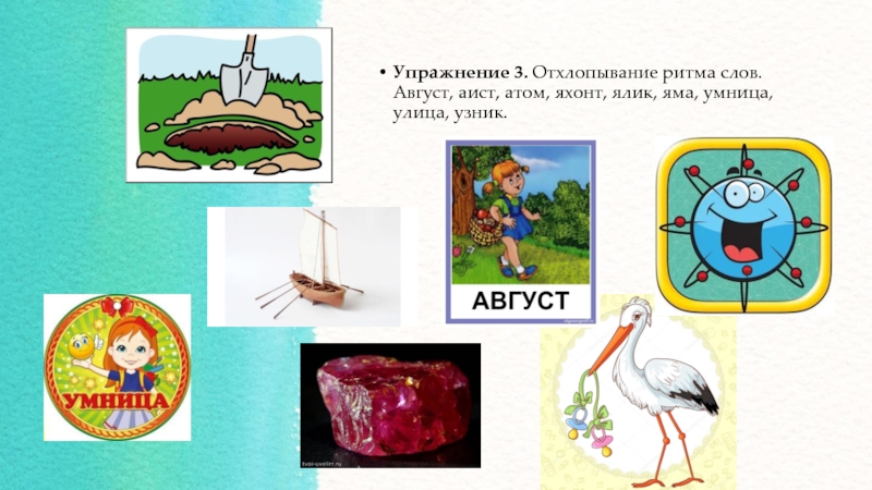 Слайд 11Упражнение 3. Отхлопывание ритма слов. Август, аист, атом, яхонт, ялик, яма,