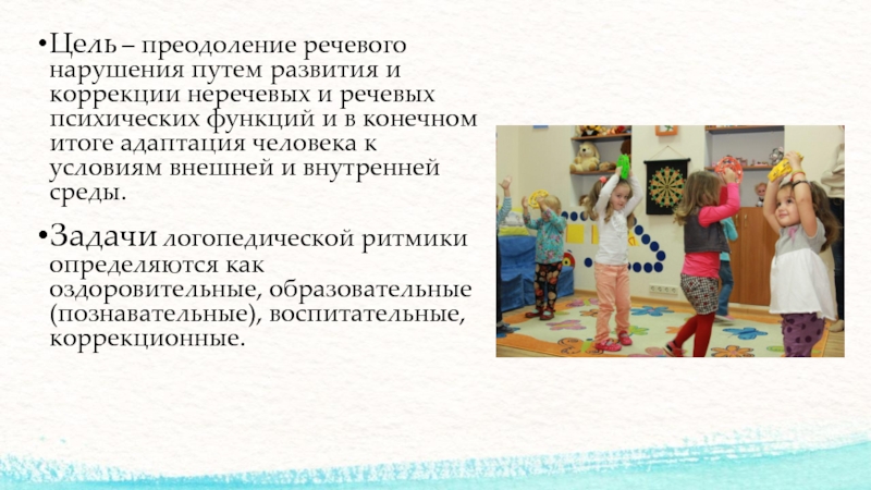 Задачи логопедической ритмики определяются как оздоровительные, образовательные (познавательные), воспитательные, коррекционные.