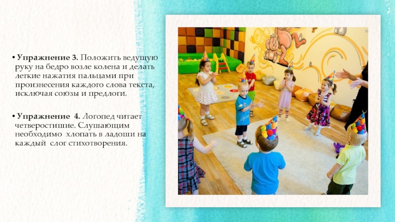 Упражнение  4. Логопед читает четверостишие. Слушающим необходимо  хлопать в ладоши на каждый  слог стихотворения.