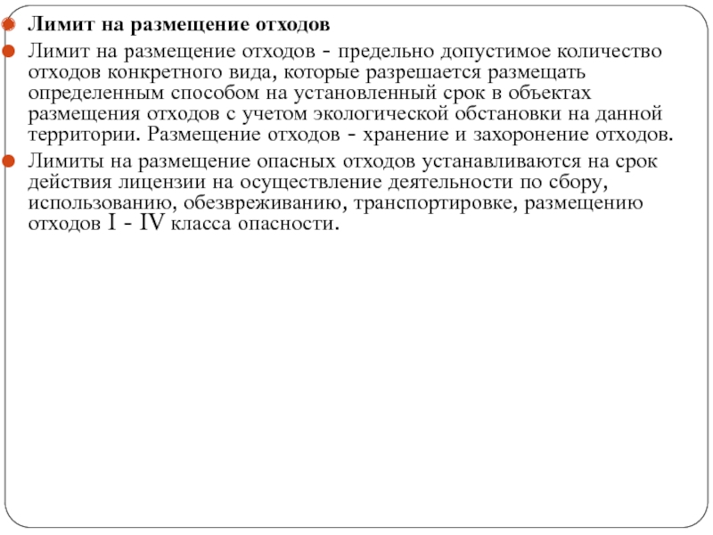 установленный срок в объектах размещения отходов с учетом экологической обстановки на данной территории. Размещение отходов - хранение и захоронение отходов.