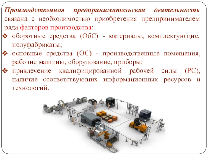Слайд 7Производственная предпринимательская деятельность связана с необходимостью приобретения предпринимателем ряда факторов