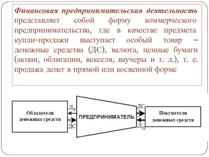 Слайд 13Финансовая предпринимательская деятельность представляет собой форму коммерческого предпринимательства, где в