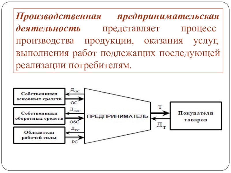 Слайд 6Производственная предпринимательская деятельность представляет процесс производства продукции, оказания услуг, выполнения