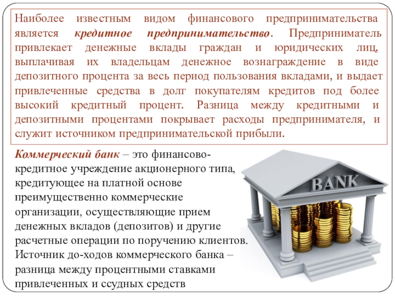 Слайд 14Наиболее известным видом финансового предпринимательства является кредитное предпринимательство. Предприниматель привлекает