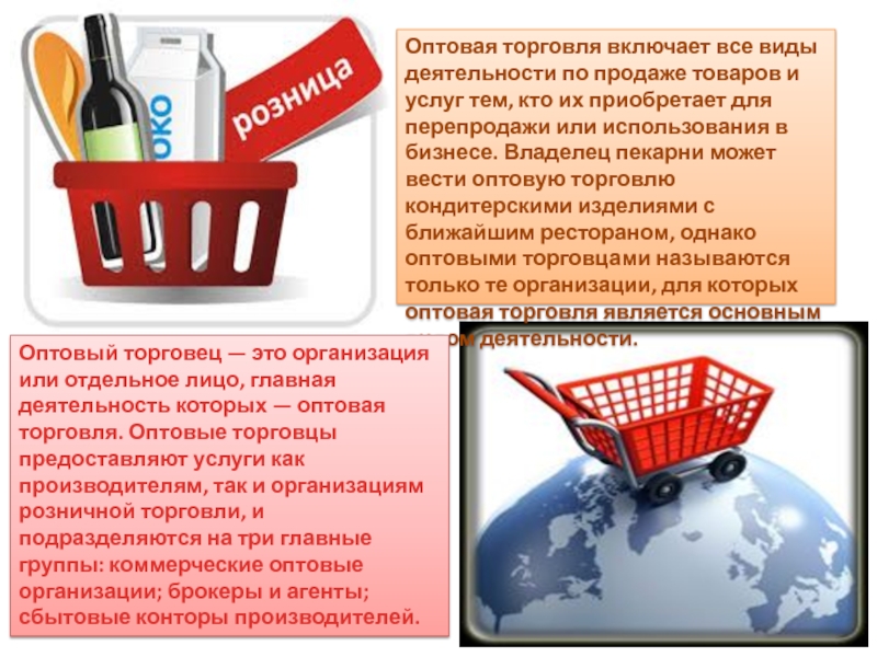 Оптовый торговец — это организация или отдельное лицо, главная деятельность которых — оптовая торговля. Оптовые торговцы предоставляют услуги как производителям, так и организациям розничной торговли, и подразделяются на три главные группы: коммерческие оптовые организации; брокеры и агенты; сбытовые конторы производителей.