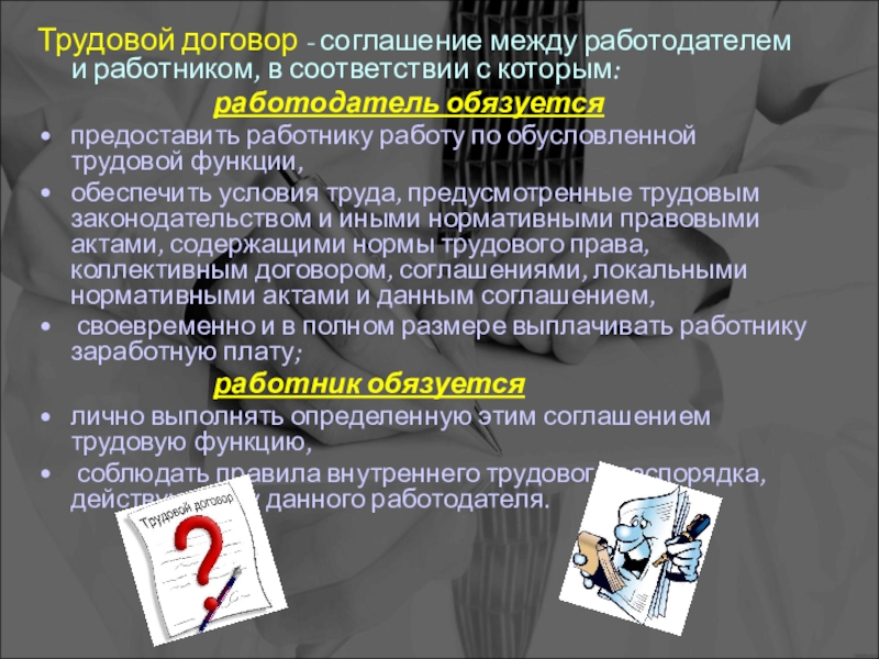 Слайд 2Трудовой договор - соглашение между работодателем и работником, в соответствии