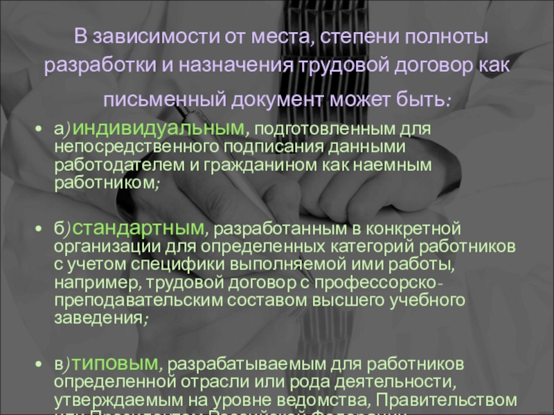 б) стандартным, разработанным в конкретной организации для определенных категорий работников с учетом специфики выполняемой ими работы, например, трудовой договор с профессорско-преподавательским составом высшего учебного заведения;