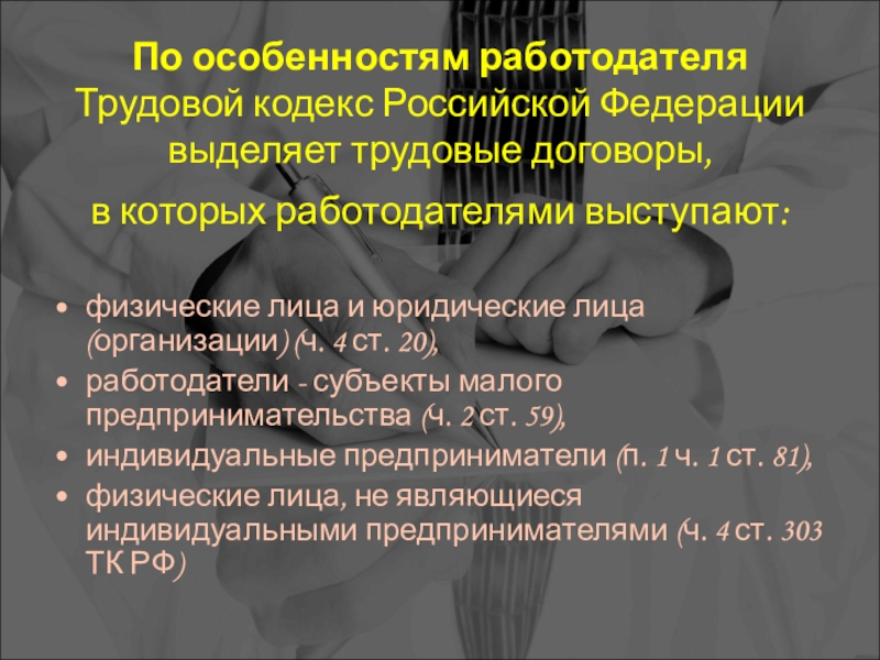 Слайд 8По особенностям работодателя Трудовой кодекс Российской Федерации выделяет трудовые договоры,