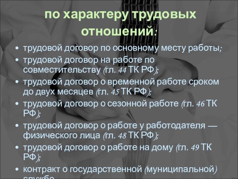 договор на работе по совместительству (гл. 44 ТК РФ);
