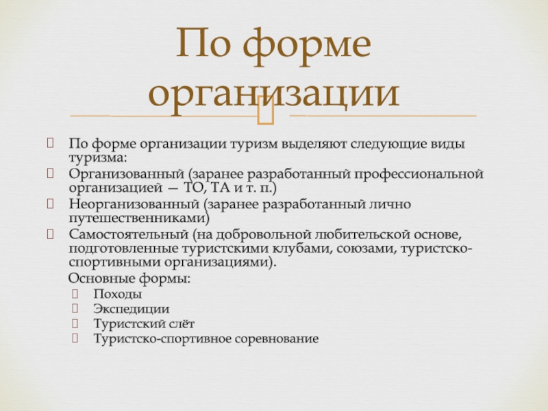 любительской основе, подготовленные туристскими клубами, союзами, туристско-спортивными организациями). Основные формы: