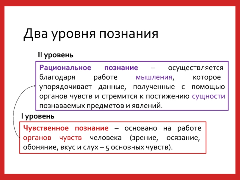 Рациональное познание – осуществляется благодаря работе мышления, которое упорядочивает данные, полученные с помощью органов чувств и стремится к постижению сущности познаваемых предметов и явлений.