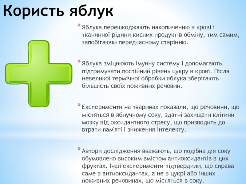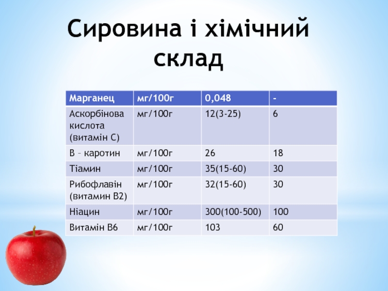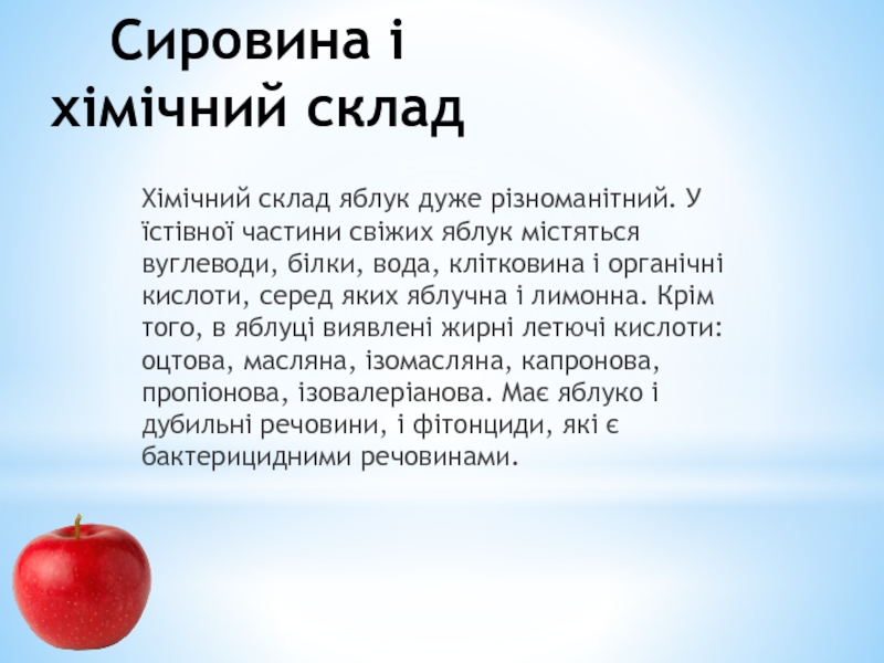 Слайд 4Хімічний склад яблук дуже різноманітний. У їстівної частини свіжих яблук