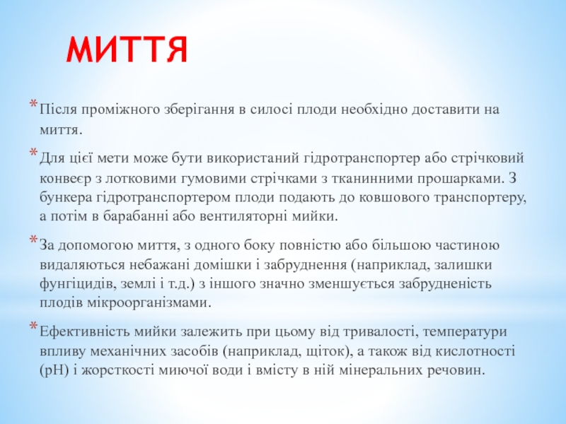 Після проміжного зберігання в силосі плоди необхідно доставити на миття.