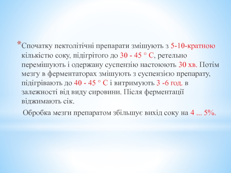 Слайд 19Спочатку пектолітічні препарати змішують з 5-10-кратною кількістю соку, підігрітого до