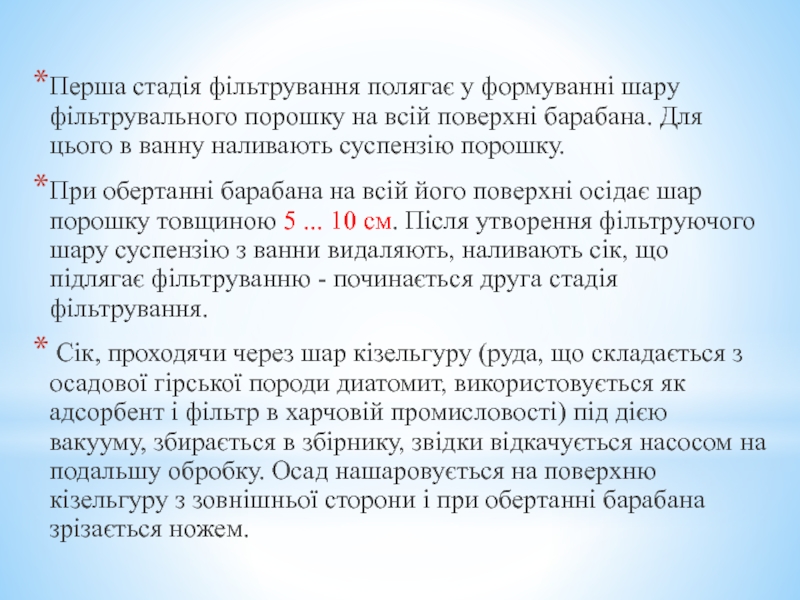 обертанні барабана на всій його поверхні осідає шар порошку товщиною 5 ... 10 см. Після утворення фільтруючого шару суспензію з ванни видаляють, наливають сік, що підлягає фільтруванню - починається друга стадія фільтрування.