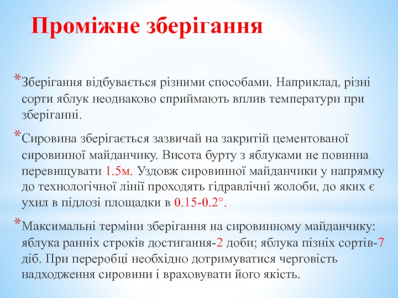 Максимальні терміни зберігання на сировинному майданчику: яблука ранніх строків достигання-2 доби; яблука пізніх сортів-7 діб. При переробці необхідно дотримуватися черговість надходження сировини і враховувати його якість.