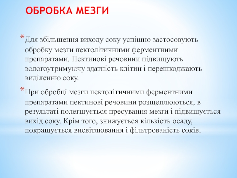 При обробці мезги пектолітичними ферментними препаратами пектинові речовини розщеплюються, в результаті полегшується пресування мезги і підвищується вихід соку. Крім того, знижується кількість осаду, покращується висвітлювання і фільтрованість соків.